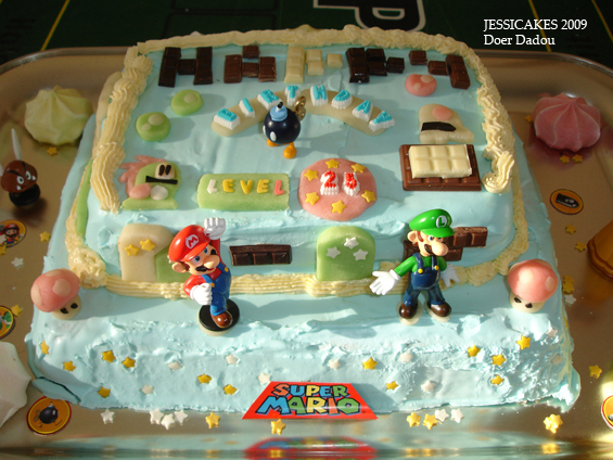 Réalisé en septembre 2009 par mon frère, un gâteau au yaourt avec des pépites de chocolat et un glaçage royal bleu. Le tout entouré de crème au beurre et de personnages tantôt en plastique, tantôt faits de pâte d’amande, et de mini carrés de chocolat pour l’effet Pixel Art.