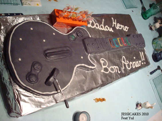 Nous sommes fans de jeux vidéo, et mon frère ayant presque toutes les guitares des jeux musicaux qui se font sur le marché, eh bien pourquoi pas un gâteau guitare ?