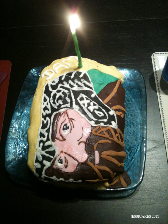 Je suis partie d’un dessin de Gimli, glissé sous une pochette plastifiée, et j’ai recomposé le visage en pâte à sucre, glaçage pour le casque, stylo chocolat et poudre irisée rose pour les joues et le nez.
