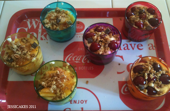 Aujourd’hui c’est cerise, pêche et le détail qui tue des céréales Extra au chocolat au-dessus. Autrement avec des boudoirs j’en ai fait aux framboises, mangue et ananas. Tout est permis !