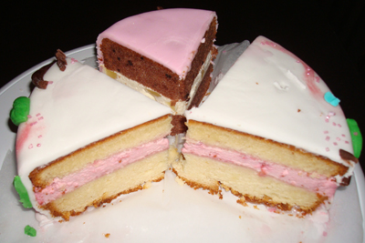 Une envie, de faire un gâteau genre Wedding Cake. Pour une amie féminine jusqu’au bout des ongles. Là on envoie du lourd : base de gâteau au yaourt avec mousse aux framboises, et haut du gâteau au chocolat et mousse poires.