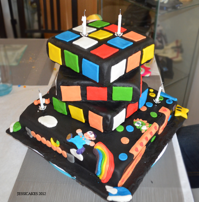 Les jeux vidéo sont à l’honneur pour ce gâteau aux mirabelles. Le Rubik’s cube est fait en 3 gâteaux, et la base est le 4e.