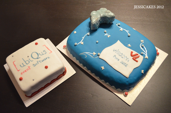 Le gâteau bleu est à la carotte, le petit papillon en coin est un gâteau au chocolat avec mousse à la framboise et recouvert de glaçage au chocolat blanc teinté. La déco est faite d’éléments en sucre et de peinture alimentaire métallisée bleu.