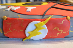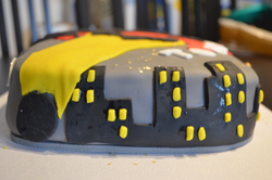 J’ai recréé tous les symboles principaux sur une feuille et les ai découpés pour m’en servir comme patrons pour sculpter la pâte à sucre. De petites boules peintes d’or métallisé alimentaire sont posées au-dessus des plaques, pour faire plus « vrai ». Je voulais en faire plus, mais faute de place c’est resté ainsi. J’ai aussi ajouté au dernier moment des étoiles sur le ciel gris de Gotham, comestibles bien sûr.