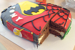 Pour l’anniversaire d’un collègue, j’ai réuni tout le gratin des super héros. L’intérieur est un gâteau au chocolat (2 en fait) et un cream cheese vanille pour faire passer le tout.