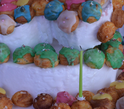 Et j’ai posé chaque choux à partir d’un dessin que j’ai fait au préalable avec les couleurs, et entouré de chouquettes.