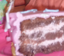 L’intérieur est du chocolat et du cream cheese framboise. J’ai coupé en 3 la base pour que l’on voit 2 traits de garniture à la découpe.