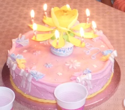 Le haut est assez simple avec des fleurs, des perles, papillons et nacre. Et laisse surtout la place à une super bougie qui lorsqu’elle est allumée s’ouvre, tourne et chante « joyeux anniversaire ».