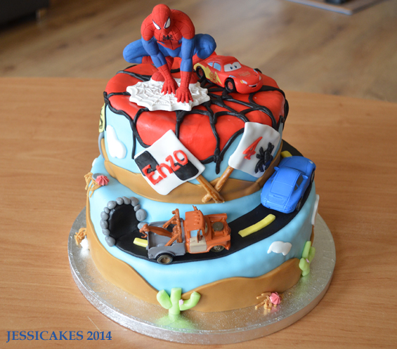 A mesure que l’on grimpe on découvre l’univers de Spiderman avec sa toile recouvrant la route désertique de Cars. Larrivée étant soulignée par les deux drapeaux. Un bel univers de garçon ^^