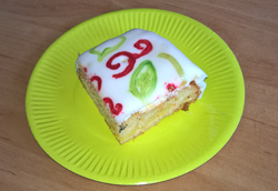 Le cylindre de briques est une génoise aux pommes râpées, compote de pommes (toute prête), et sucre Rapadura. C’est du sucre de canne complet, plus riche en goût. La génoise est séparée d’une compotée de pommes revenues dans ce même sucre.