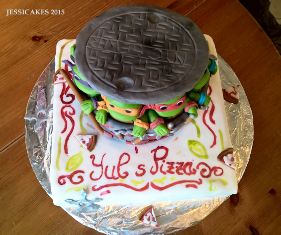 J’ai fait une mini pizza que j’ai découpé en parts et disposée sur la boite. J’ai aussi refait de petits shurikens que j’ai peint en métal (comestible aussi).