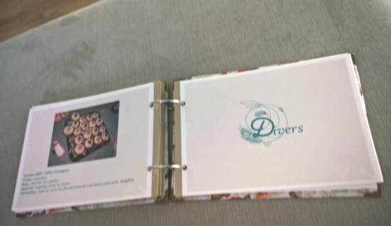 J’ai trouvé de magnifiques coins de livres en bronze pour décorer les angles et j’ai imprimé mes créations pâtissières, triées par catégories avec un petit texte accompagnant chaque réalisation.