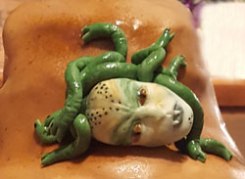 J’ai repris des refs marquantes à savoir : le trident de Poséidon, la boite de Pandore, la sur chausse d’Hermes (oui c’est un truc qu’on met par dessus une chaussure et ça a des ailes, normal quoi !), la tête d’une méduse, parce qu’en cas de pépin c’est pratique, et un méga gros éclair pour rappeler Zeus.