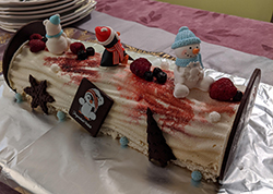 J’ai fait des sapins en chocolat avec un moule silicone que j’avais, et finalisé la déco avec des boules de sucre et des fruits rouge.