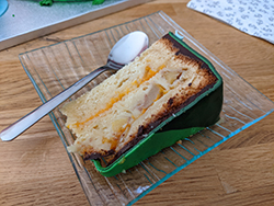 Le gâteau est aux pommes saupoudrées de cannelle, cuites dans la génoise (erreur de débutante, ça cuit mal), et j’ai ajouté entre 2 couches de génoise de la compote de pêche toute prête.