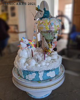 Deux petites souris en peluche s’amusent sur la montgolfière et repositionnent les fanions, avec l’aide de la licorne. Le chiffre des bougies clignote, bien sûr ^^