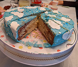 Première partie le jour J chez Nani et Papou, pendant les vacances avec comme demandé par Mademoiselle un gâteau chocolat / vanille marbré (soooo fluffy !).