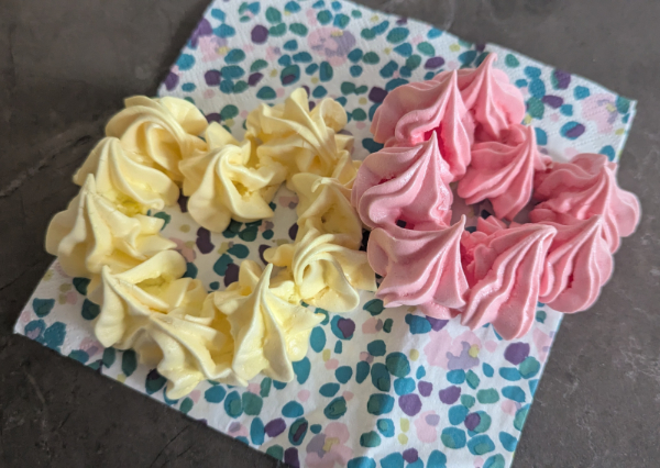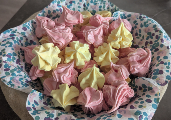 En préparation de la St Valentin, j’ai décidé de m’attaquer à l’un de mes boss d’il y a plus de 15 ans. A l’époque, j’en connaissais peu sur la pâtisserie, je n’avais pas encore de KitchenAid et j’avais surtout les mauvais ustensiles (sans parler du four). Je n’ai testé qu’une fois seulement (mouah ah, l’erreur) des meringues et comme je les ai ratées, je n’ai plus jamais osé en refaire. Et puis au détour d’une recette, il m’est resté des blanc d’œufs, et je me suis enfin lancée. Avec mes connaissances d’aujourd’hui je n’ai eu aucun problème, et même si je n’ai fait qu’une version française et pas italienne, elle étaient enfin réussies. J’ai vaincu mon petit démon culinaire qui me trollait depuis des années 💪🏻 Et je me suis même amusée à faire 2 teintes : jaune et rose, les couleurs préférées de ma fille. Alors non, les formes ne sont pas parfaites (pour gagner du temps j’ai utilisé 2 douilles différentes donc 2 motifs différents), je suis volontairement allée vite pour ne pas y passer la journée mais elles sont tout de même mimis ces petites meringues. J’ai tenté rapido 2 cœurs et un « L » (un peu à l’arrache). Elles étaient légèrement croustillantes et légères comme tout à l’extérieur, moelleuses et fondantes à l’intérieur, pas trop sucrées, à priori c’était bon.