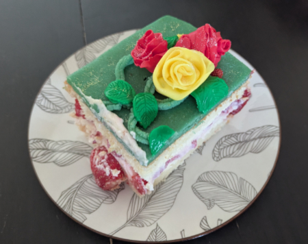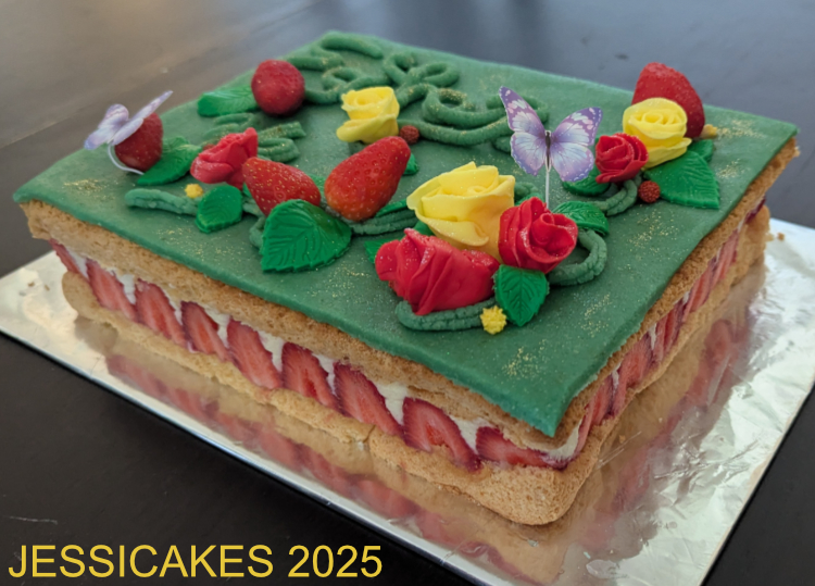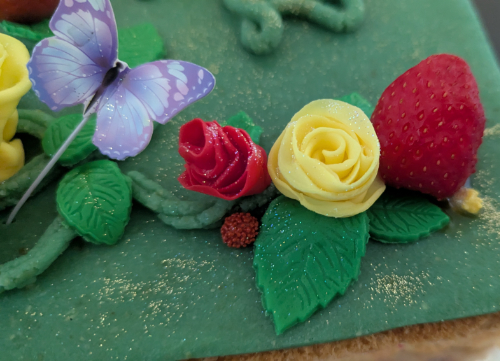 Retour sur l’anniversaire de ma maman. A cette occasion, j’ai repris ma recette désormais célèbre de fraisier sans gluten, pour que tout le monde puisse en manger (mon frère y compris). Crème mousseline et fraises fraîches pour la garniture, pâte d’amande verte pour la couverture et pour la déco : des papillons en papier fixés avec des tiges en métal, des branches magiques aux délicates feuilles composées de roses rouge et jaune teintées par mes soins, ainsi que de petites fraises fraîches et des perles de sucre pour parfaire la présentation. Pour la touche finale, j’ai parsemé des paillettes comestibles dorées sur l’ensemble. J’ai (relativement) caché son âge parmi le décor naturel car ma mère adore le voir figurer sur ses gâteaux. Petite fierté personnelle pour la création des roses que j’ai fait minute, en utilisant une technique improvisée qui regroupait plusieurs méthodes et accessoires déjà utilisés auparavant. Le résultat n’est certes pas aussi beau qu’avec la techique conventionnelle mais c’est tout de même réussi. Encore une création qui aura vite été dévorée.