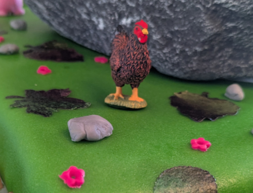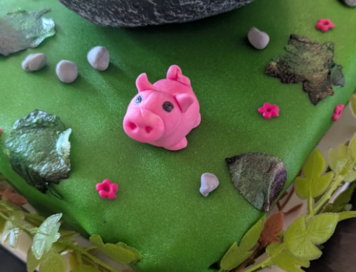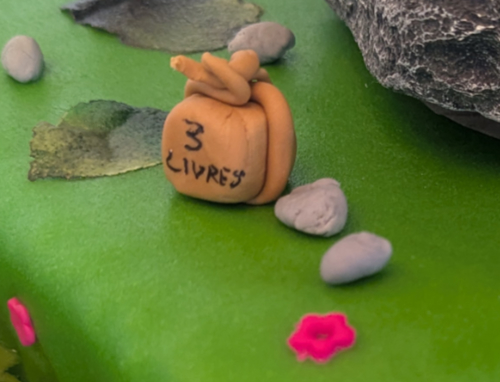 Pour la déco, Krokmou m’a pris environ 5h (je suis très très fière des détails de l’aile réparée sur la queue 😁), les fleurs, les coquillages, les poissons et le panier ont été créés en 3h, à une vache près. J’ai teinté les coquillages et y ai ajouté de la poudre alimentaire perlée, les poissons ont de la poudre argentée sur eux.
