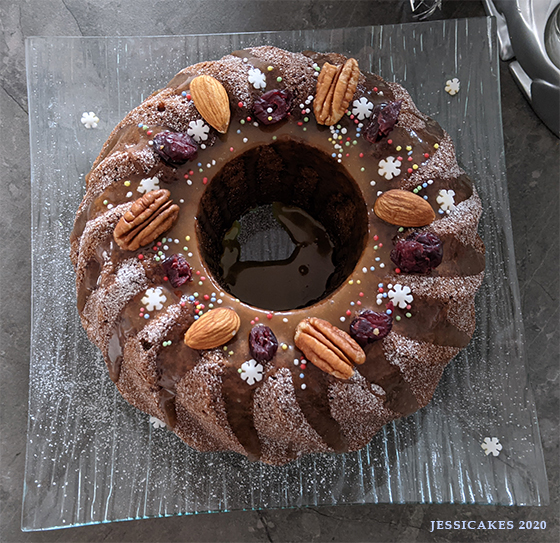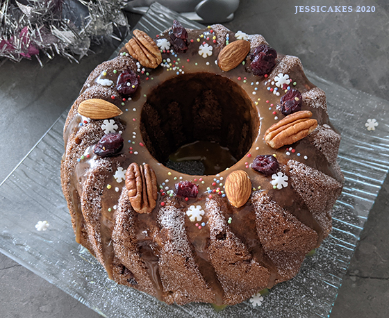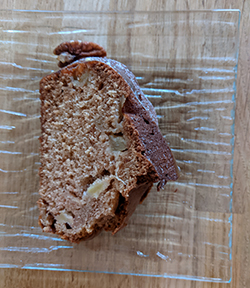 Le gâteau est aux pommes saupoudrées de cannelle, cuites dans la génoise (erreur de débutante, ça cuit mal), et j’ai ajouté entre 2 couches de génoise de la compote de pêche toute prête.