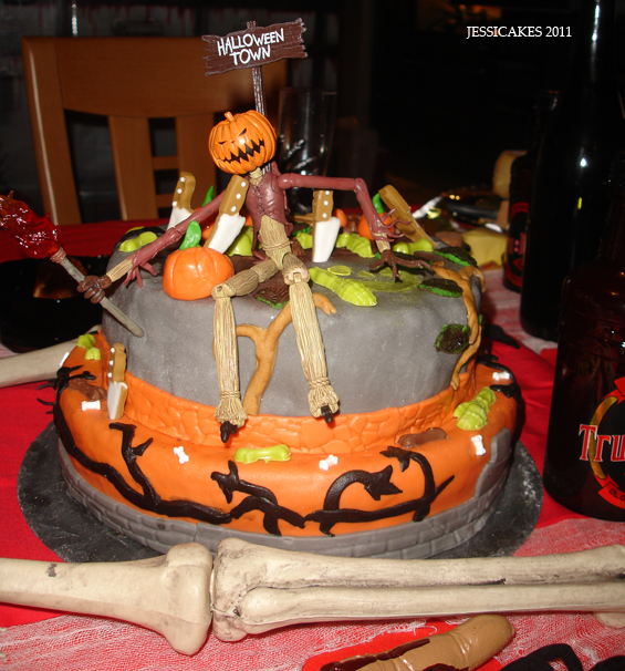 Personnage légendaire d’Halloween, Jack du film l’étrange Noël de M. Jack fait sa loi sur ce gâteau. Décor à base de pâte à sucre, de petits couteaux en sucre et de bouts de squelettes en chocolat fondus dans des moules spécifiques.