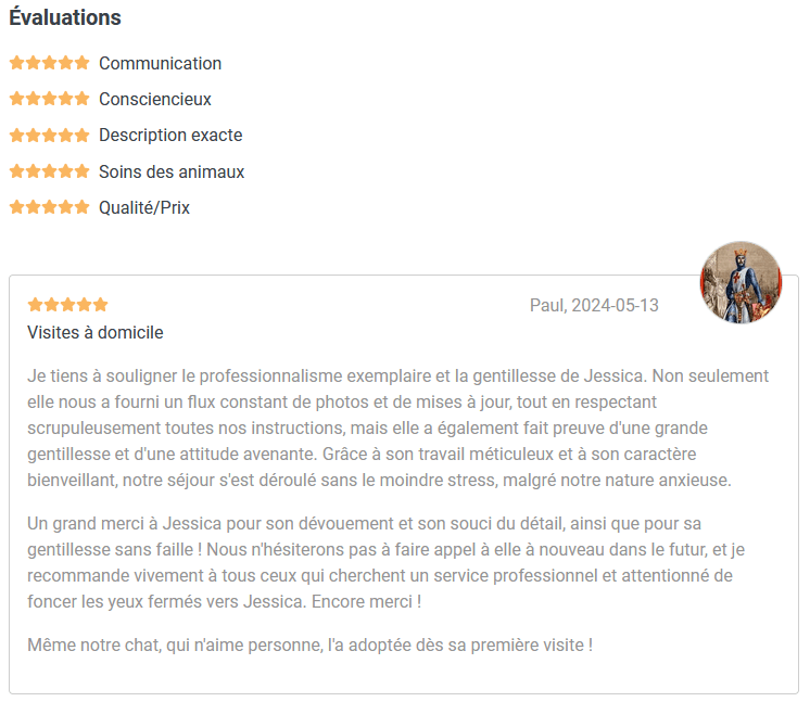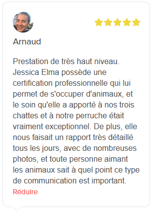 Je recommande les yeux fermés Jessica pour la garde des animaux. Elle a gardé pendant plusieurs jours mes 3 chats âgés de 17, 15 et 2 ans et j’ai été plus que satisfaite de la prestation. C’est une personne qui aime profondément les animaux et qui est aux petits soins tant pour nos protégés que pour les propriétaires en prenant le temps de nous envoyer des photos, des vidéos, de faire un petit compte-rendu et ce pour chaque journée où elle s’est déplacée à notre domicile pour s’en occuper 🙂 C’est très rare de rencontrer un tel professionnalisme et une telle implication chez une personne alors je n’hésiterai pas à faire appel à nouveau à ses excellents services et à la recommander 😀 merci encore ! NGUYEN – 08-04-2024
