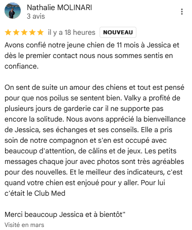 N’hésitez pas à publier votre avis sur Google et Facebook, c’est très précieux pour moi et pour les propriétaires d’animaux dans leurs recherches 😉